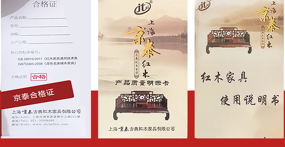 京泰古典紅木家具生產(chǎn)的產(chǎn)品 每一套都掛有【一證一卡一書(shū)】
